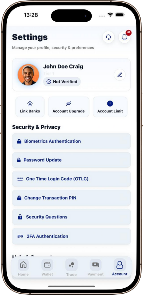 Rest easy with 2FA for logins, OTPs for transactions, and advanced real-time fraud protection keeping your funds secure.